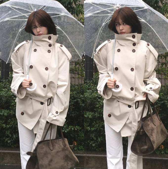 그룹 아이브의 안유진이 비 오는 날에 오버핏 하이넥 트렌치코트로 멋스러운 레인룩을 완성했다.