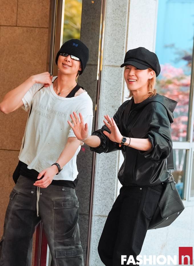 그룹 BTS(방탄소년단)의 알엠과 지민이 힙한 와이드와 시크한 시크니의 극과 극 공항패션으로 시선을 강탈했다.