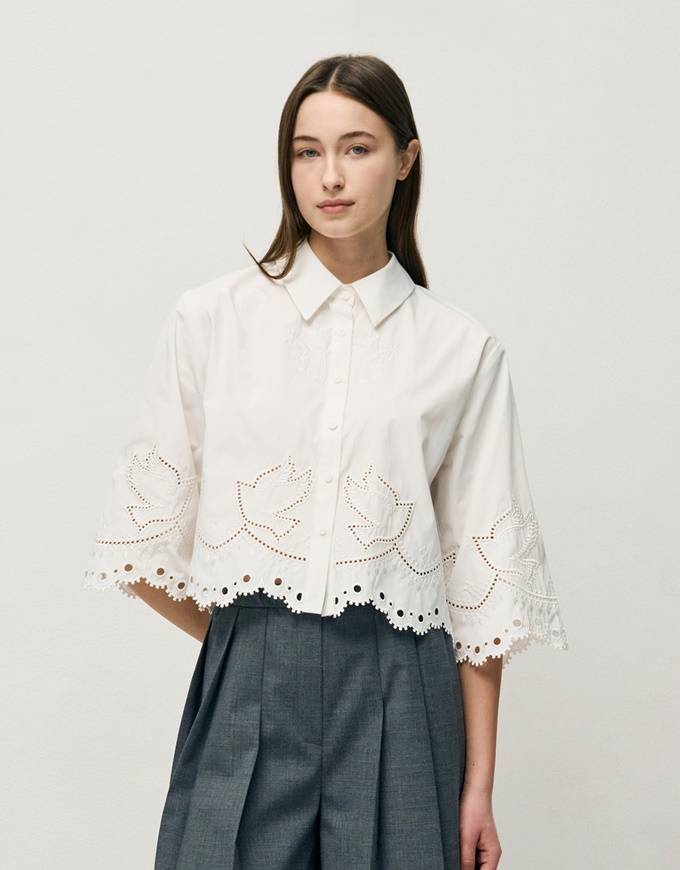 프렌치 컨템포러리 브랜드 '베르니스(BERENICE)'의 펀칭 블라우스는 플라워 패턴의 시스루한 자수 장식과 펀칭 기법이 더해져 경쾌하고 로맨틱한 매력을 발산한다.