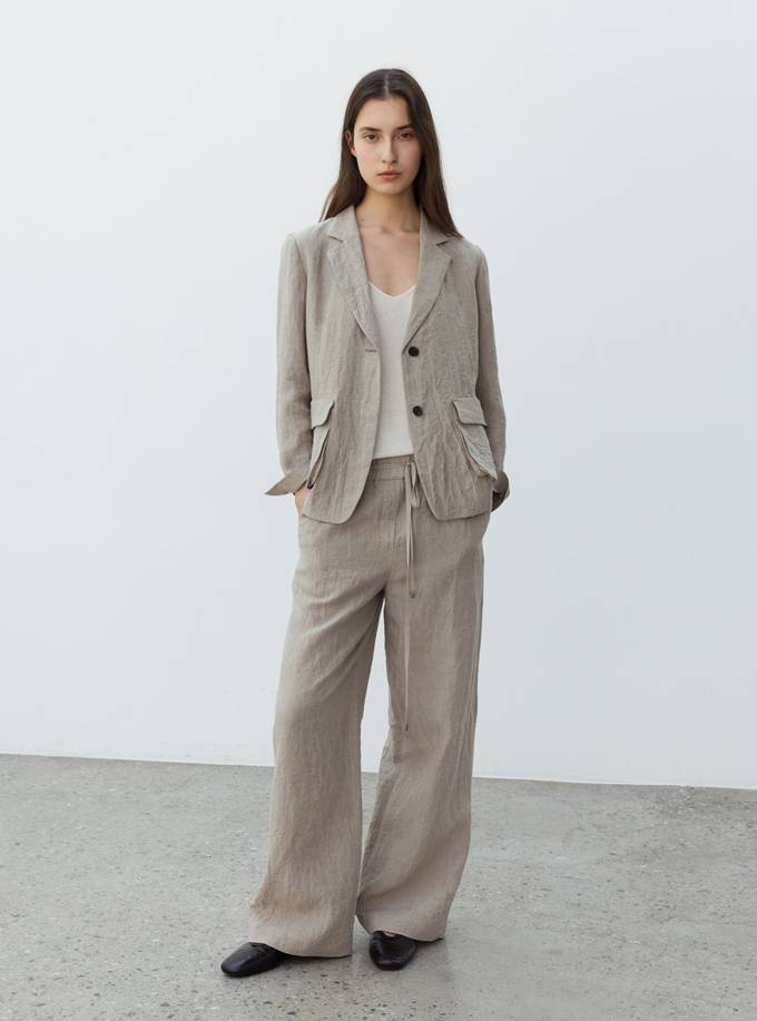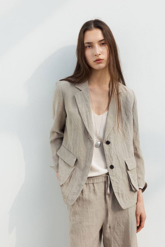 자연스러운 구김과 내추럴한 텍스처가 매력적인 아이템으로 같은 소재의 린넨 팬츠와 셋업으로 출시되었다. 출근룩을 포함한 오피스룩, 일상룩으로 안성맞춤이다.