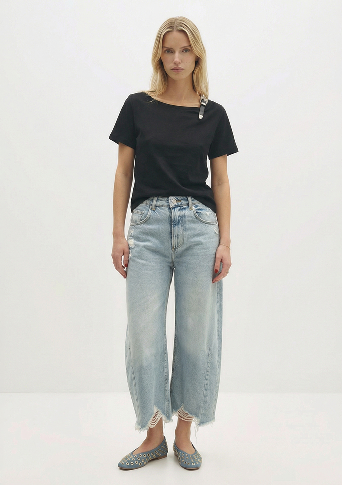 프렌치 컨템포러리 브랜드 베르니스(BERENICE) 베럴 진은 자연스러운 워싱과 곡선 실루엣, 밑단 컷오프와 데미지 디테일이 캐주얼하고 감각적인 포인트를 더해준다.
