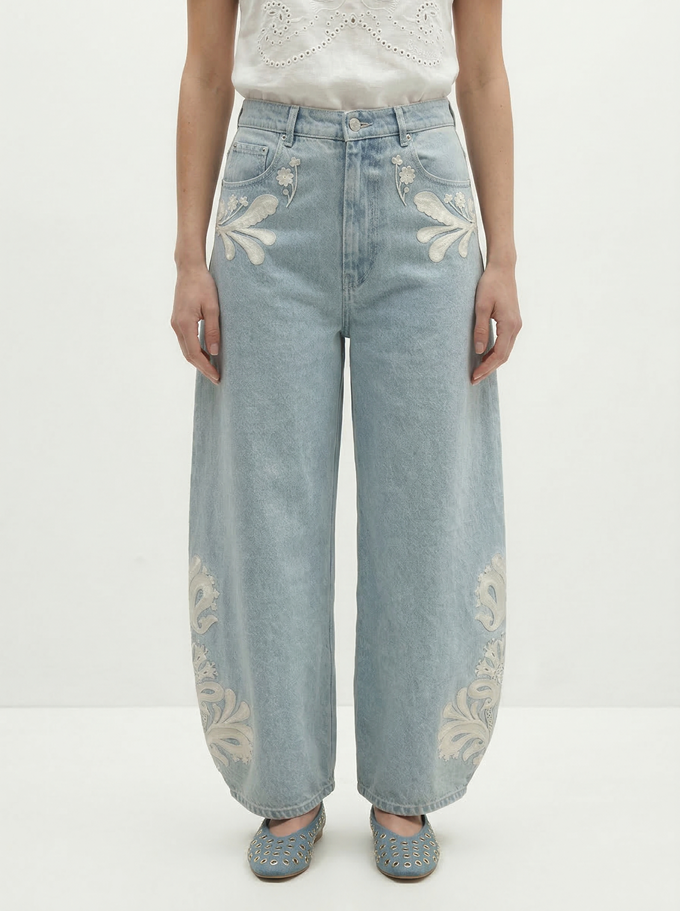 프렌치 컨템포러리 브랜드 베르니스(BERENICE) 베럴 진은 양 사이드에 에스닉한 패턴의 자수 포인트와 항아리같은 둥근 실루엣이 조화를 이룬다.