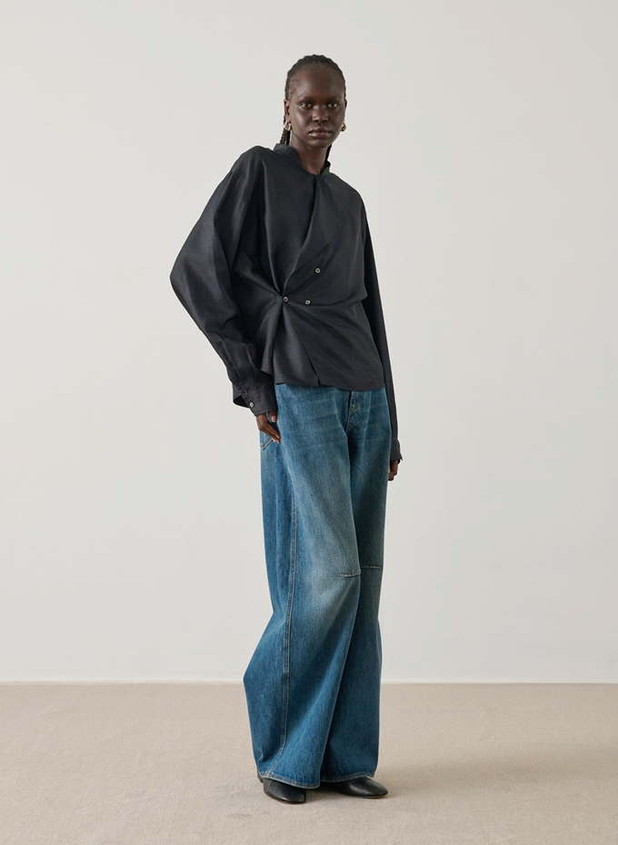 프렌치 컨템포러리 브랜드 '쉐르(SOEUR)의 다크 그레이 베럴 진은 블루 컬러와는 또 다른 빈티지한 매력을 선사한다.