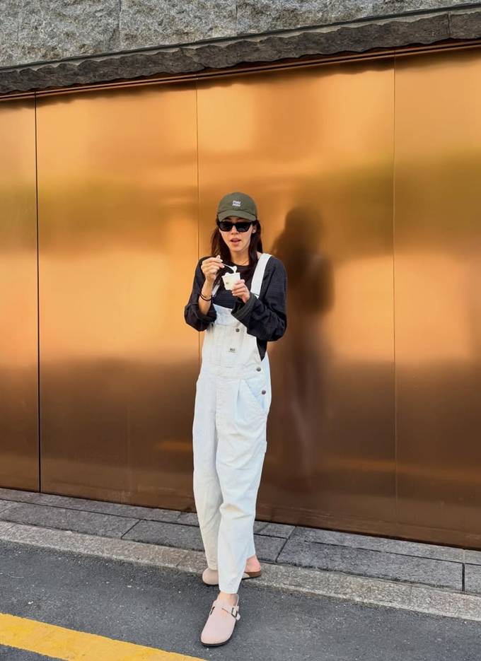 공개한 사진에서 손담비는 블랙 롱 티셔츠에 여유로운 핏의 멜빵 팬츠를 입고 볼캡과 선글라스를 매치한 꾸안꾸 산책룩으로 감각적인 데일리 스타일을 선보였다.