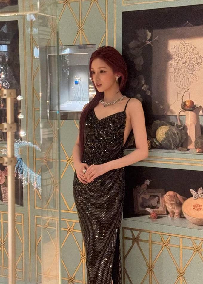 그룹 아이들의 우기가 슬림한 머메이드 핏의 블랙 슬립 드레스룩으로 한층 성숙해진 여인의 향기를 물씬 풍겼다.