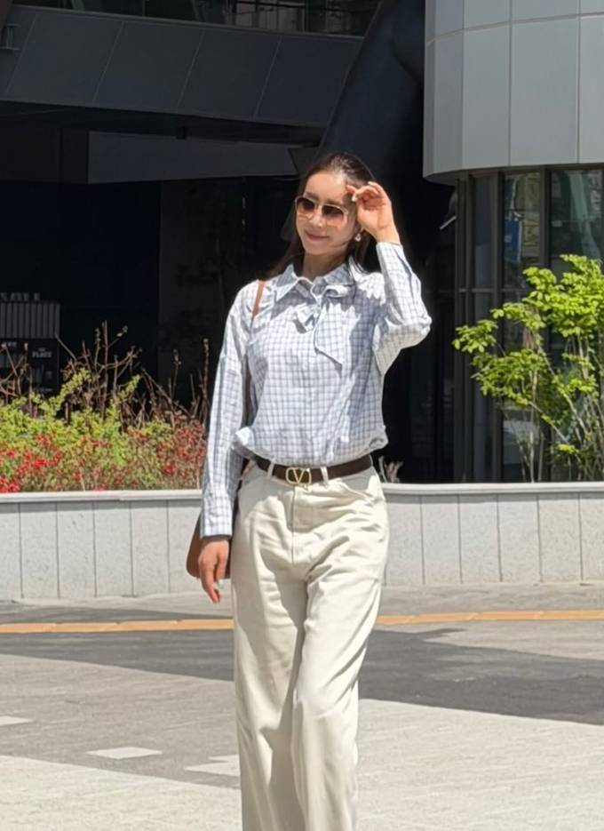 배우 한다감이 리본 타이가 포인트인 블루 체크 셔츠 외출룩으로 러블리한 분위기를 자아냈다.