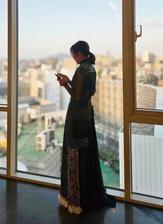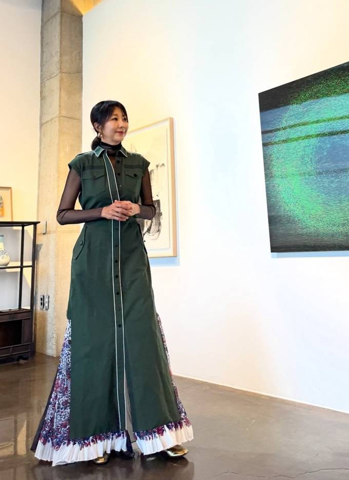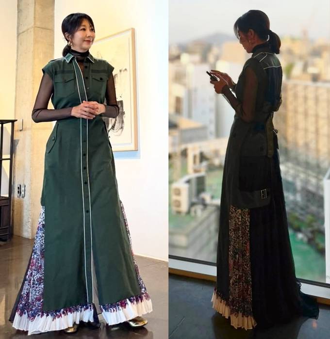 공개한 사진에서 전미라는 감각적인 레이어드 원피스룩으로 남다른 비율을 드러냈다. 전미라는 짙은 그린 컬러의 슬리브리스 롱 원피스를 중심으로, 시스루 블랙 이너를 매치해 세련된 분위기를 연출했다.