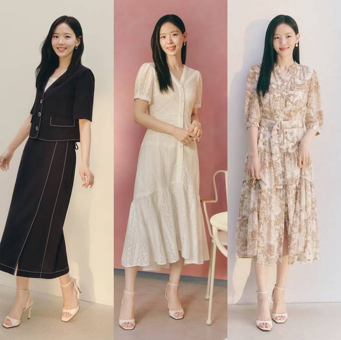 블랙 셋업 원피스로는 도회적인 세련미를, 화이트 플레어 원피스로는 청순하면서도 로맨틱한 분위기를, 베이지 패턴 원피스로는 우아하면서도 클래식한 분위기를 자아냈다.