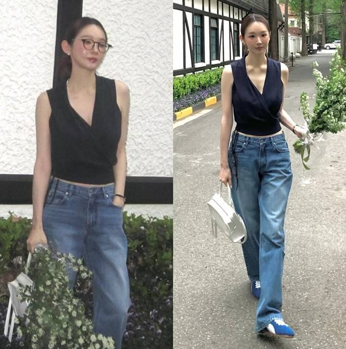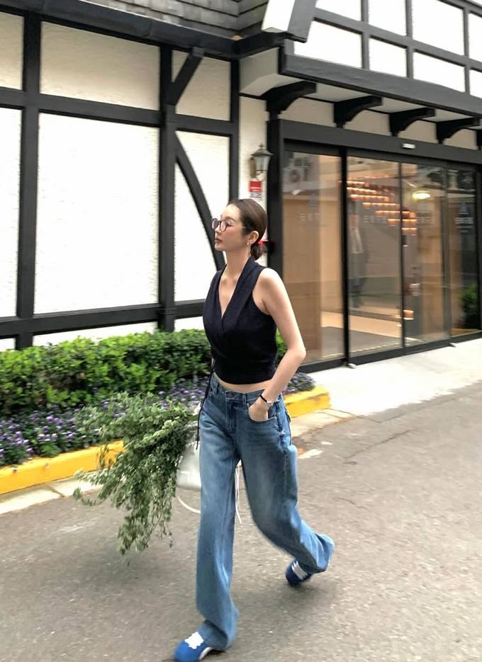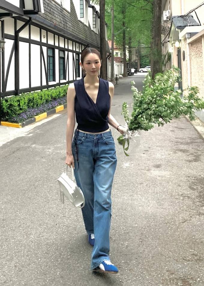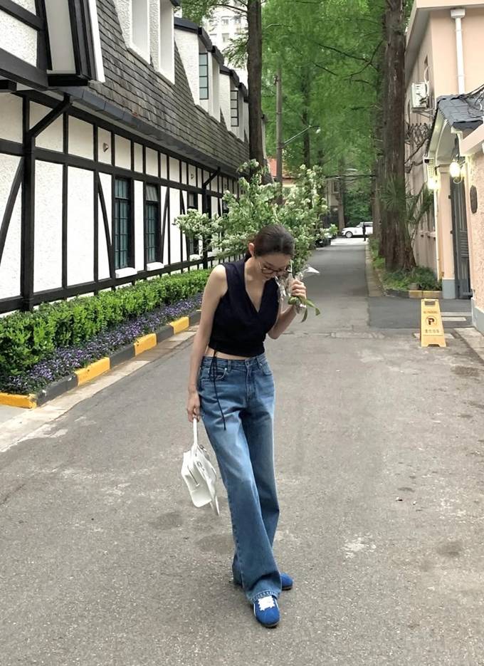 하의는 여유로운 핏의 블루 데님 팬츠를 매치해 군더더기 없는 미니멀한 아이템 조합으로 세련된 데일리룩의 정석을 보여줬다.