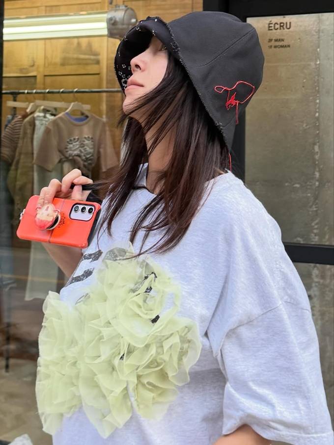 공개한 사진에서 황신혜는 루즈핏 화이트 티셔츠에 입체적인 노란 플라워 장식이 더해진 포인트 아이템을 착용해 단번에 시선을 끌었다. 밋밋할 수 있는 기본 티셔츠에 볼륨감 있는 꽃 디테일을 더해 유니크하면서도 화사한 분위기를 완성한 것이 특징이다.