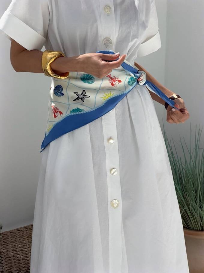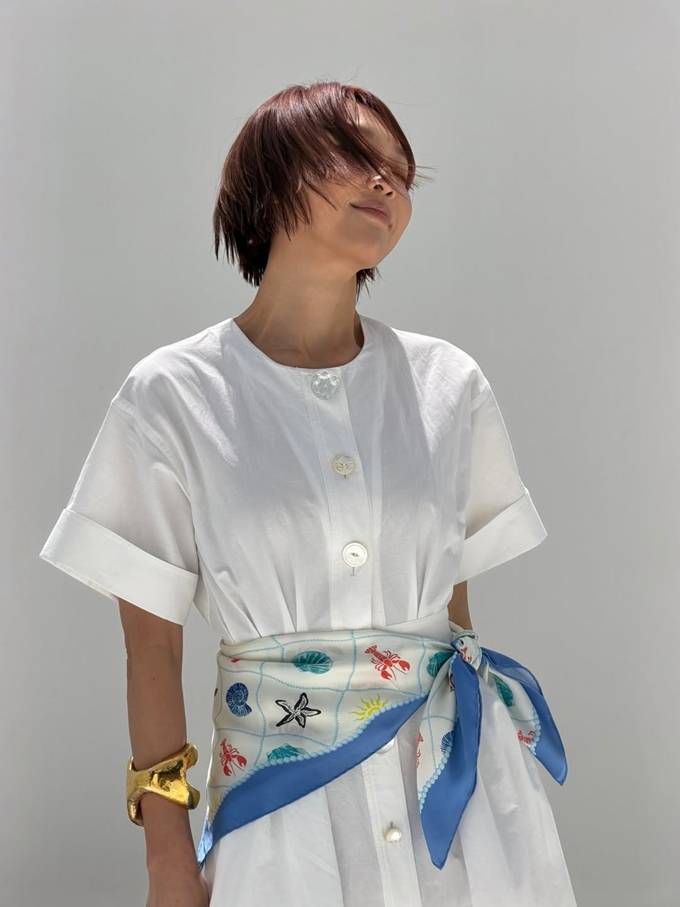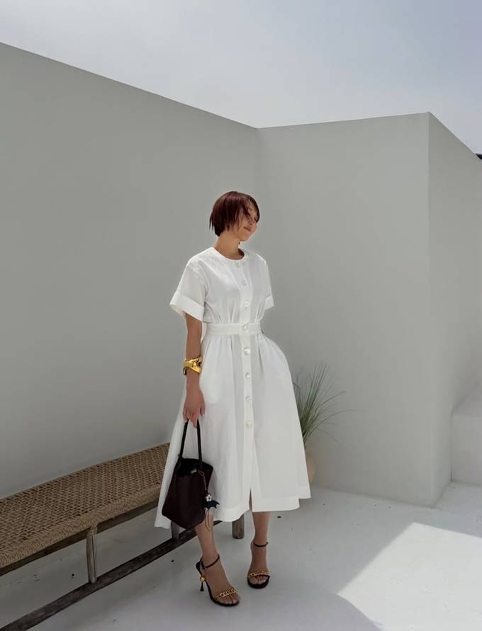 화이트 컬러 원피스로는 깔끔한 라운드 넥과 큼직한 버튼 디테일이 돋보이며, 허리에는 패턴 스카프를 더해 청량한 컬러감과 쿨한 분위기를 자아냈다.