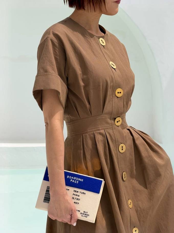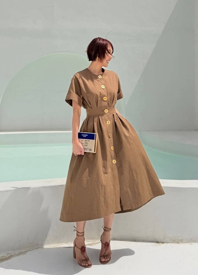 브라운 톤의 버튼 원피스는 한층 성숙하고 우아한 무드를 연출했다. 허리를 잡아주는 벨티드 디자인과 플레어 실루엣이 여성스러운 라인을 강조하며, 여유로운 기장감이 고급스러운 분위기를 더했다.