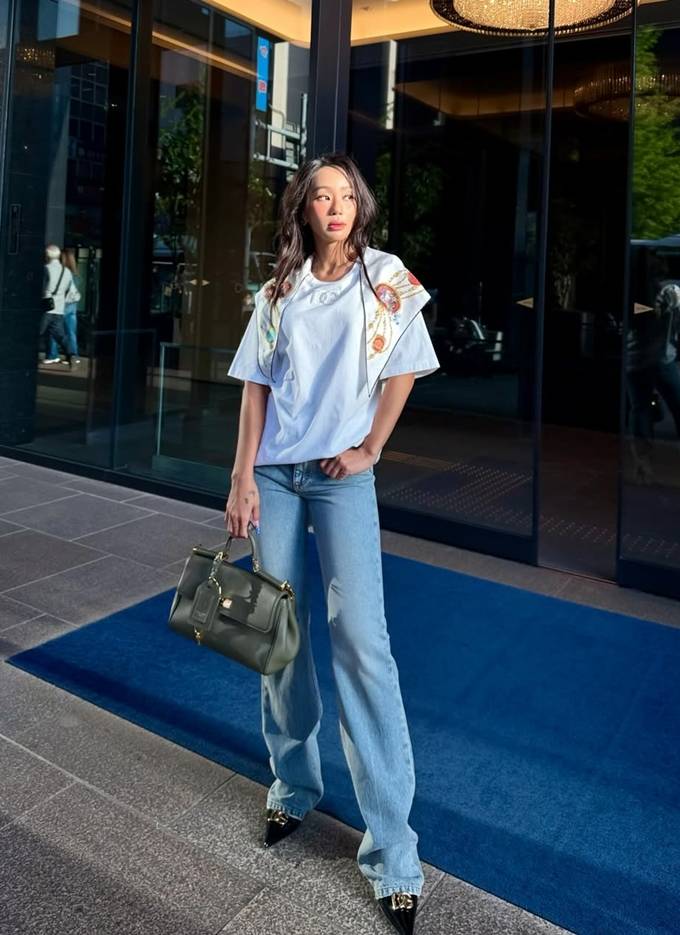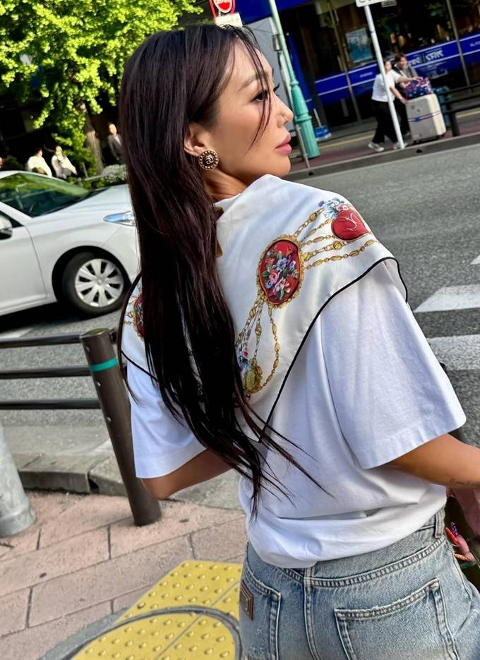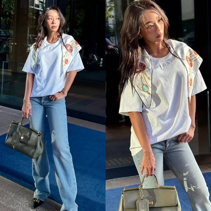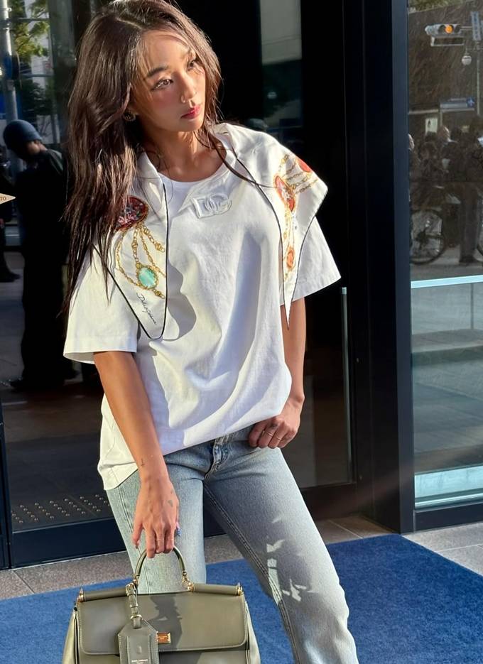 효린은 군더더기 없는 화이트 오버핏 티셔츠에 가볍게 걸친 프린트 패턴 스카프를 레이어드한 스타일로 센스 넘치는 여행 스트릿룩을 완성했다.