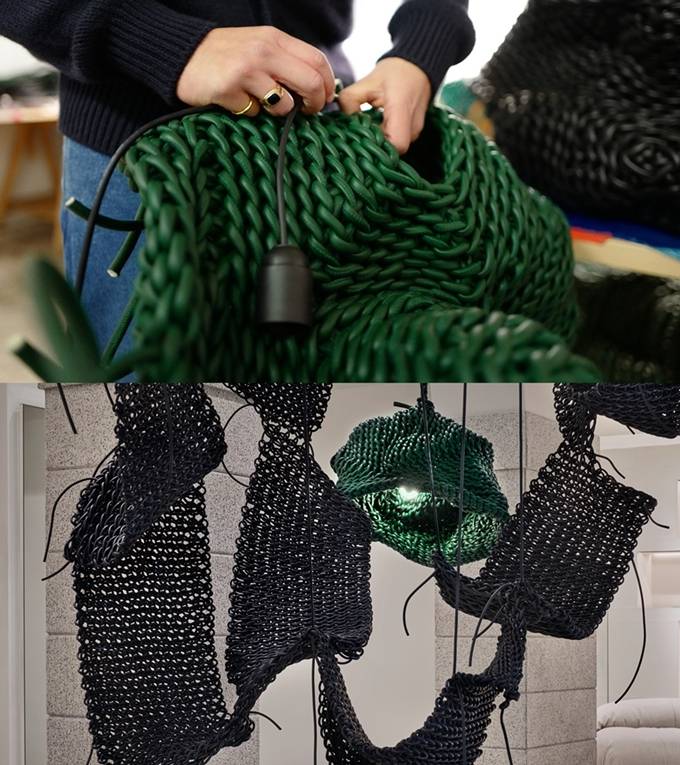 설치 작품 ‘Lightful(라이트풀)’은 공중에 매달린 직조 형태에 보테가 베네타 가죽을 엮어 완성한 빛 조형물을 결합했다.