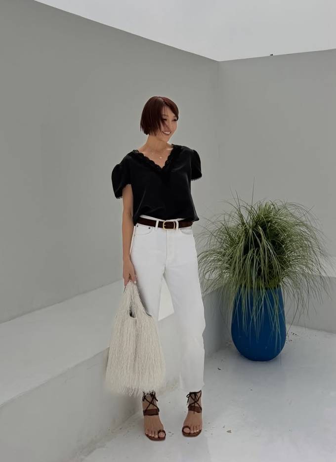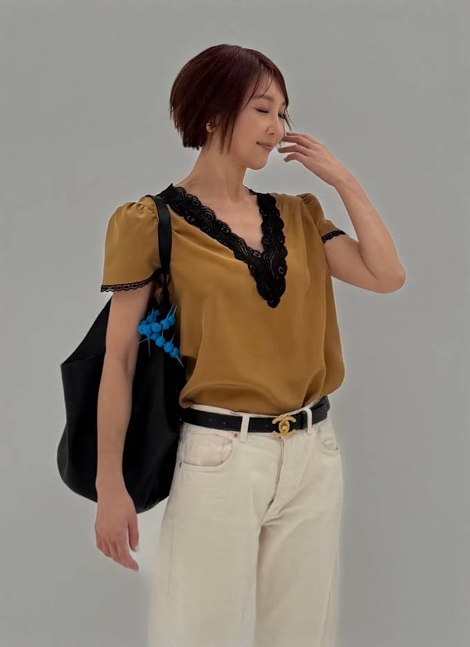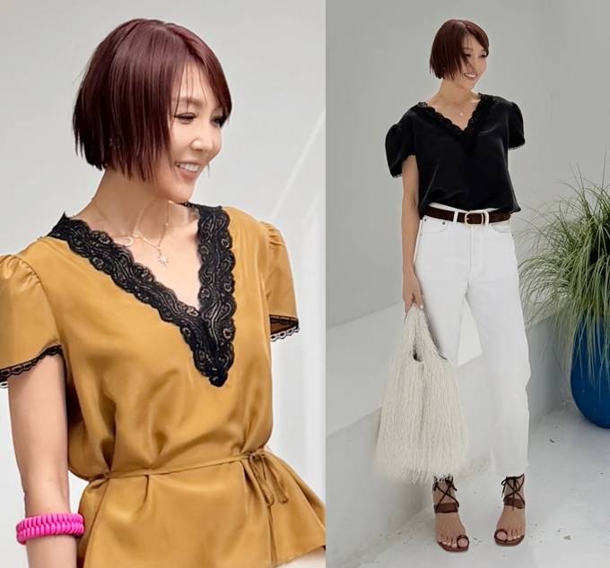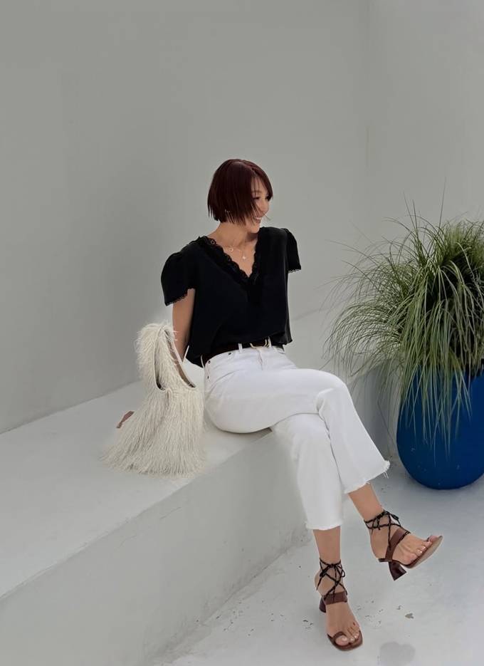 머스터드 컬러 톱은 블랙 레이스 트리밍이 더해져 우아하면서도 여성스러운 분위기를 강조했다. 블랙 레이스 톱으로는 화이트 팬츠를 매치해 강렬한 대비를 연출했다.