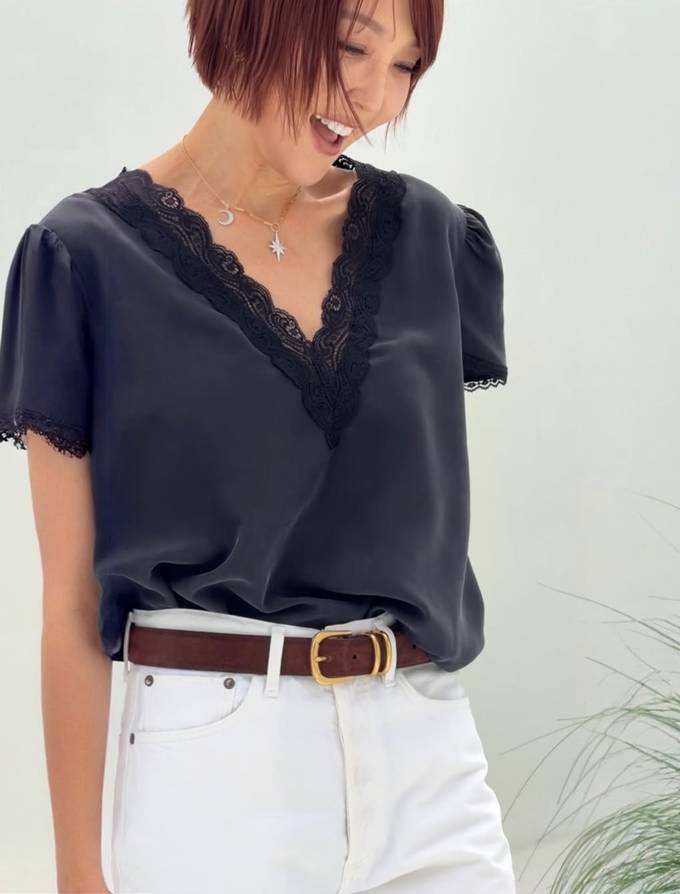 란제리 특유의 섬세한 디테일이 돋보이면서도, 팬츠와의 조합으로 과한 노출 없이 균형 잡힌 스타일링을 완성했다.