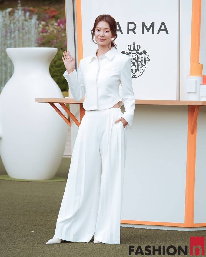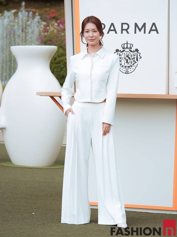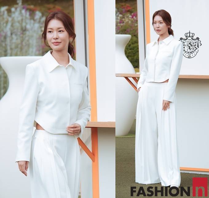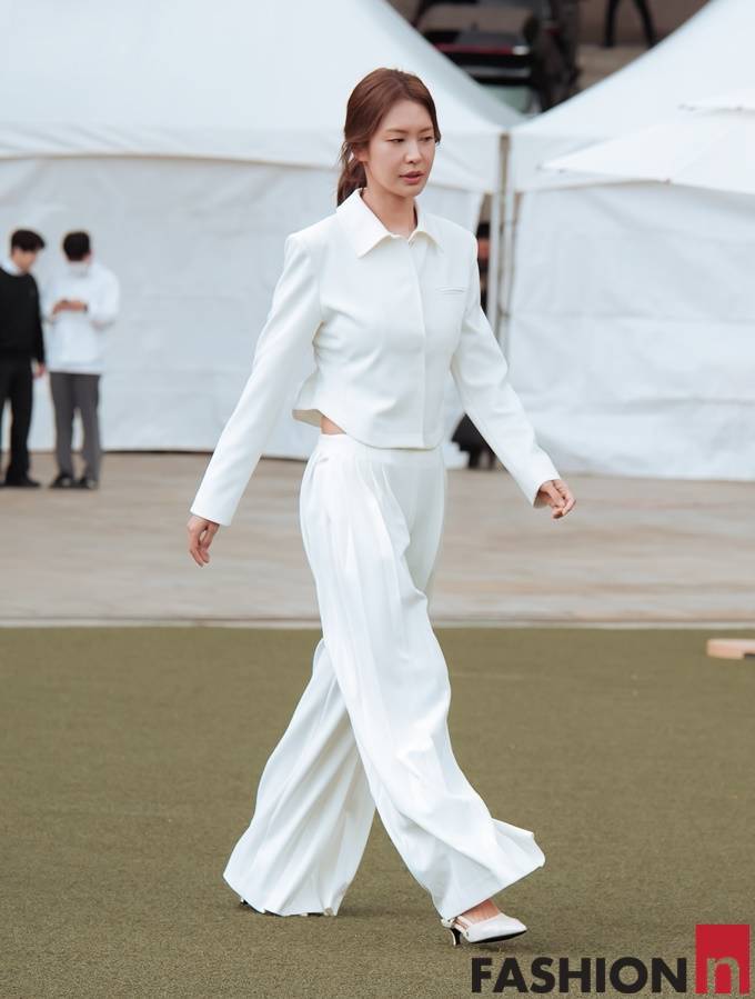 배우 정유진이 화이트 슈트룩으로 눈부신 각선미를 뽐냈다.
