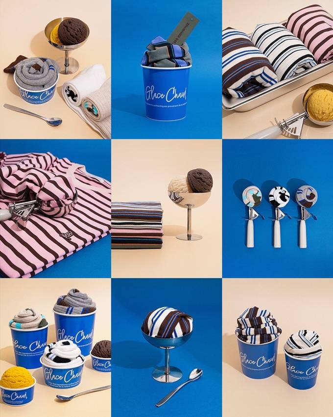협업 컬렉션은 총 3종으로 구성했다. 그 중 아이스크림 티셔츠와 아이스크림 양말은 글라쇼의 시그니처인 바닐라, 딸기, 말차, 초콜릿맛 아이스크림 색감을 스트라이프 패턴과 컬러믹스로 표현한 점이 특징이다.