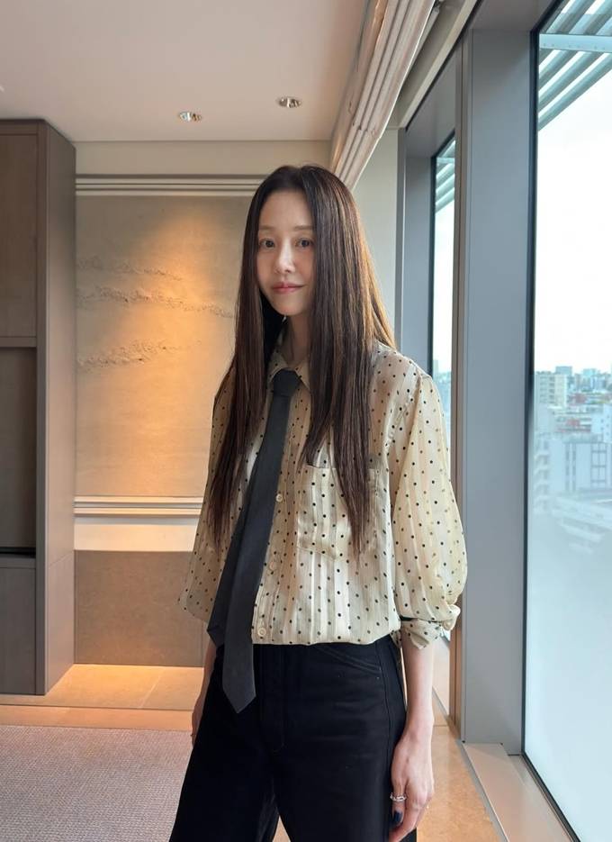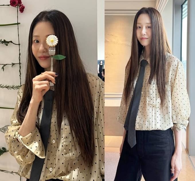 이날 고현정은 잔잔한 도트 패턴이 들어간 아이보리 셔츠에 블랙 타이를 매치해 클래식하면서도 위트 있는 룩을 선보였다.