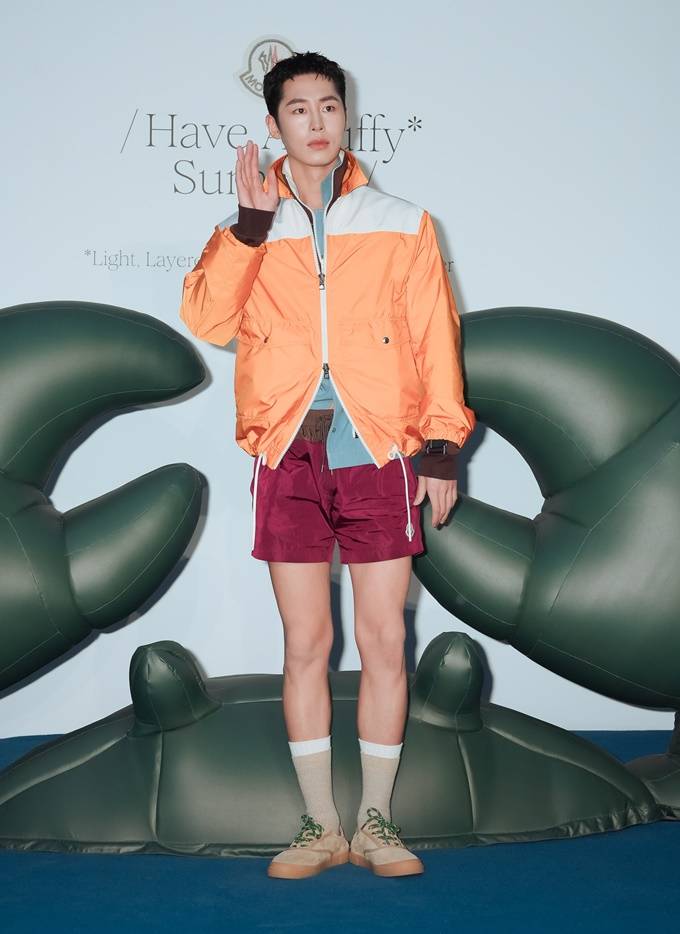 이날 이재욱은 컬러 블록의 오렌지 바람막이 재킷과 쇼츠를 매치한 감각적인 애스레저룩으로 스타일을 뽐냈다.