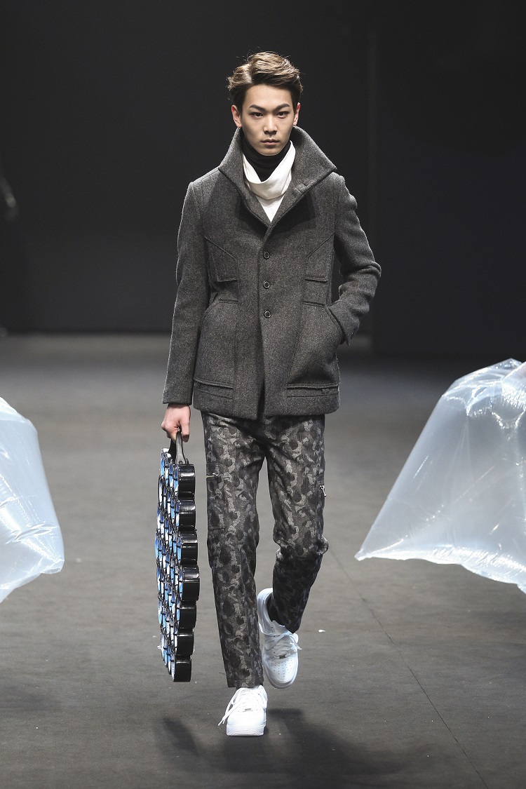 가장 한국적인 미니멀 아방가르드라는 주제를 매 시즌 무대에 올려 마니아 군을 형성하고 있는 디자이너 김선호. 그의 브랜드 그라운드웨이브가 이번 시즌에 선보인 테마는 모더니즘 아키텍처(modernism architecture). 모더니즘 건축과 밀리터리 웨어에어 영감 받은 스타일을 울과 가죽, 면 등의 소재와 그레이, 네이비, 올리브 블랙 컬러로 표현한 것이 눈길을 끌었다. 짧은 길이의 간결한 팬츠, 박시한 코트와 재킷, 후드가 달린 아우터 등도 눈에 띄었으며, 투톤 컬러 블록과 소재의 믹스도 인상적이었다.