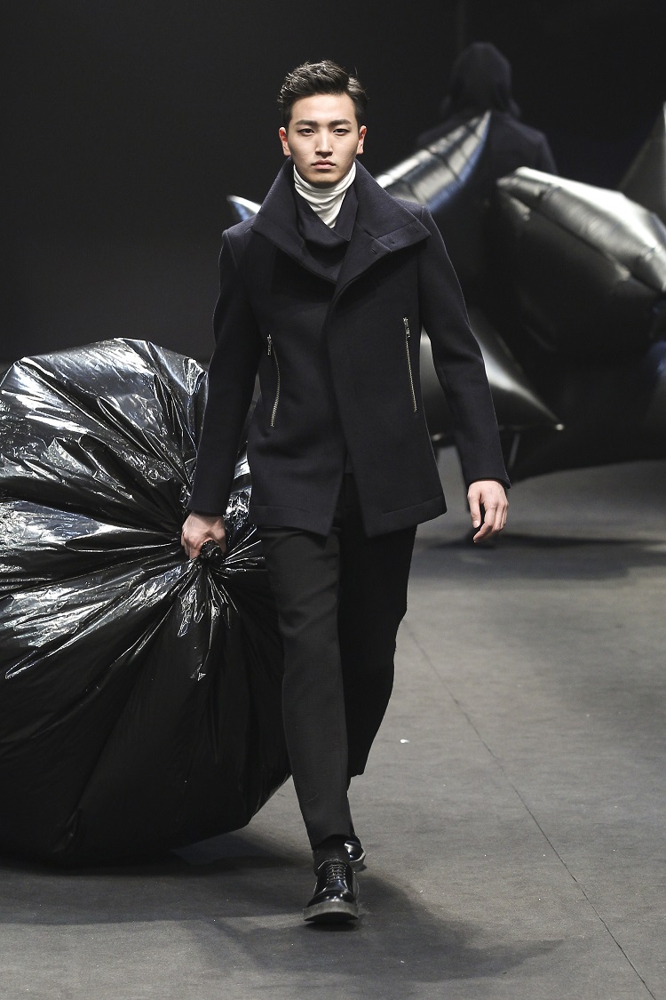 도전적인 감성을 지향하는 남성복 디자인 브랜드, 도미닉스웨이는 'Find your beauty within'라는 주제 아래 종전의 남성복에서 시도되지 않았던 다양한 스타일을 시도해 남성복에 숨어 있는 다채로운 매력들을 이끌어내는 브랜드다. 2014 F/W 콘셉트는 ‘Dead Snow’로 ‘Wild Military’, ‘A Warlike Nation’, ‘Battle Field’를 부제로 가졌다. 가죽, 워싱 코튼, 울, 개버딘, 벨벳 등의 소재가 카키, 블랙, 화이트, 그레이, 블루, 루비 컬러와 만나 각진 숄더 등의 밀리터리 쉐이프를 보여준 것.