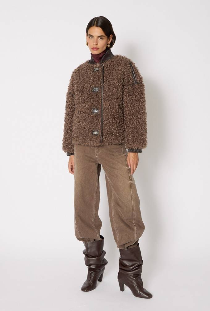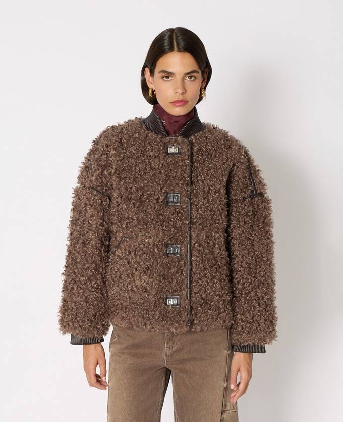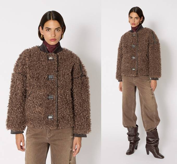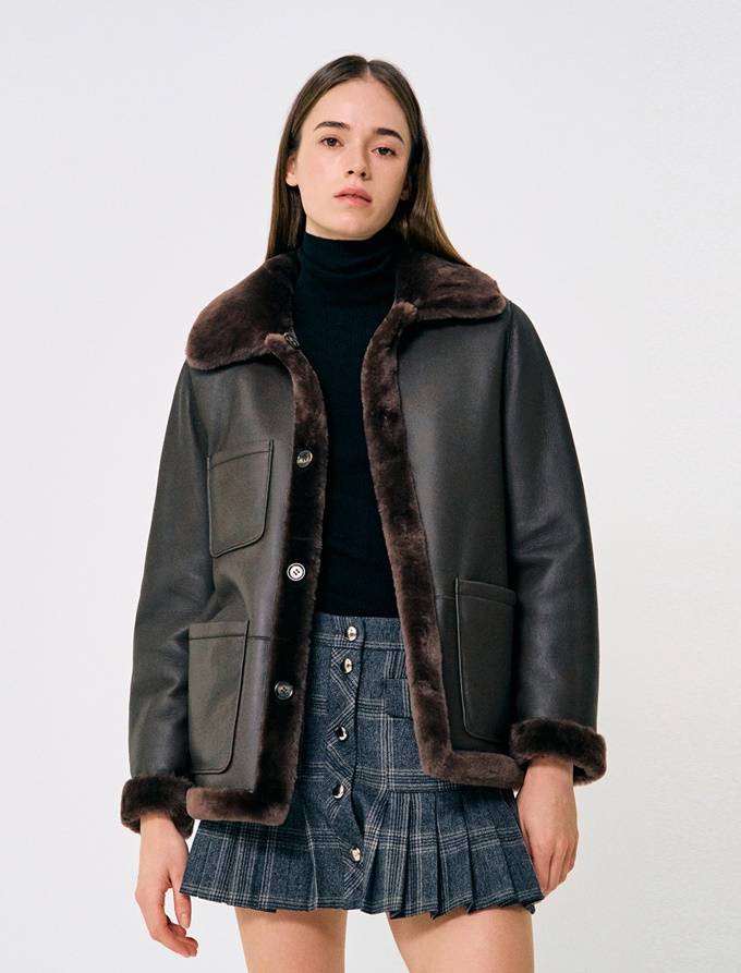 프렌치 컨템포러리 브랜드 '마쥬(MAJE)'의 시어링 리버시블 무스탕 재킷은 겉감은 부드러운 양털, 안감은 고급스러운 양가죽으로 되어있는 양면 자켓으로 실용적 겨울 아우터로 제격이다.