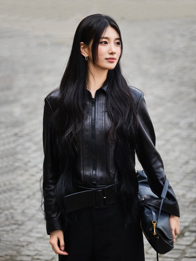 12. 배우 수지는 파리 패션위크 2026 F/W 셀린느 패션쇼에서 커다란 벨트 디테일의 매끈한 레더 재킷으로 시크한 블랙룩을 연출했다.