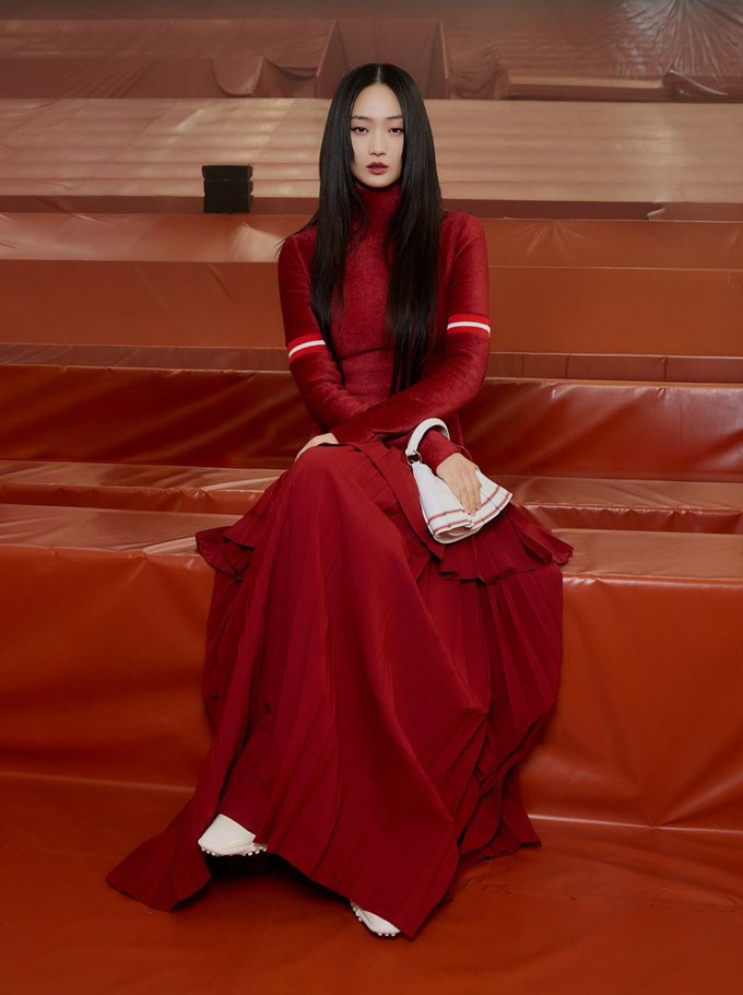 38. 모델 신현지는 테니스 코트에서 열린 라코스테의 2026 F/W 컬렉션에서 강렬한 레드 드레스룩을 선보였다.